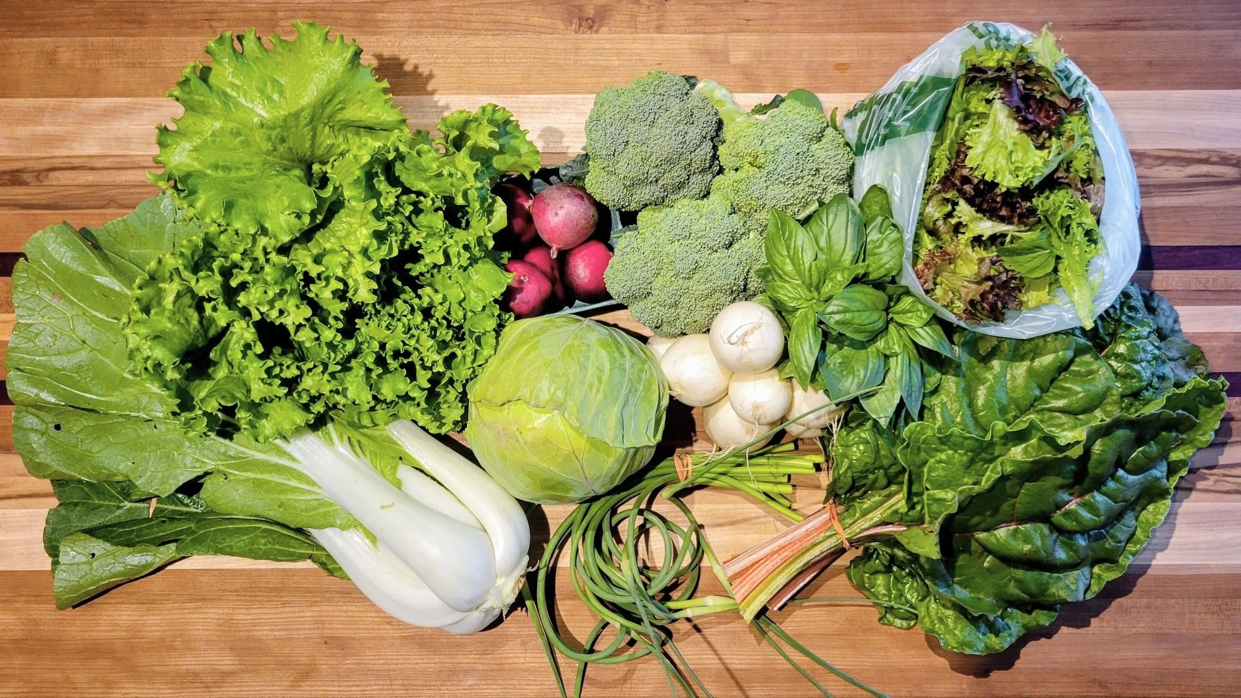 Our boxes are filled with a rotation of seasonal fruits and vegetables. Everything from salad greens, kales, turnips, carrots, tomatoes, peppers, melons, cucumbers, summer and winter squash, onions, potatoes, and so much more!